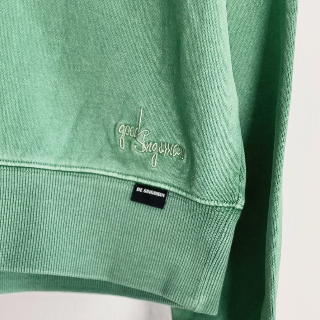 定番の11oz裏毛を使用したシングスマンではお馴染みのガーメントダイによるオリジナルカラー。ほどよく退色した SEA GREEN 色はお気に入りのニューカラーです。